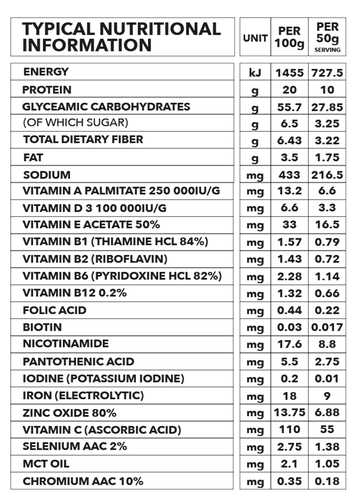 White Maize, Soya Isolate 90, Sugar, Flavours, Salt, Sucralose, Vitamin A, Vitamin D3, Vitamin E, Vitamin B1, Vitamin B2, Vitamin B6, Vitamin B12, Folic Acid, Biotin, Nicotinamide, Pantothenic Acid, Iodine, Iron, Zinc Oxide, Vitamin C, Selenium, Mct Oil, Chromium